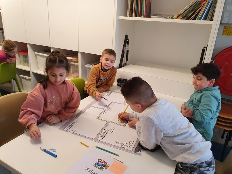 De Vliegeniers uit groep 3 en 4 denken dat het mogelijk is om het afval in de wijk rondom de school nog verder te verminderen. In kleine groepjes overleggen ze hoe ze dat precies aan zouden kunnen pakken.
